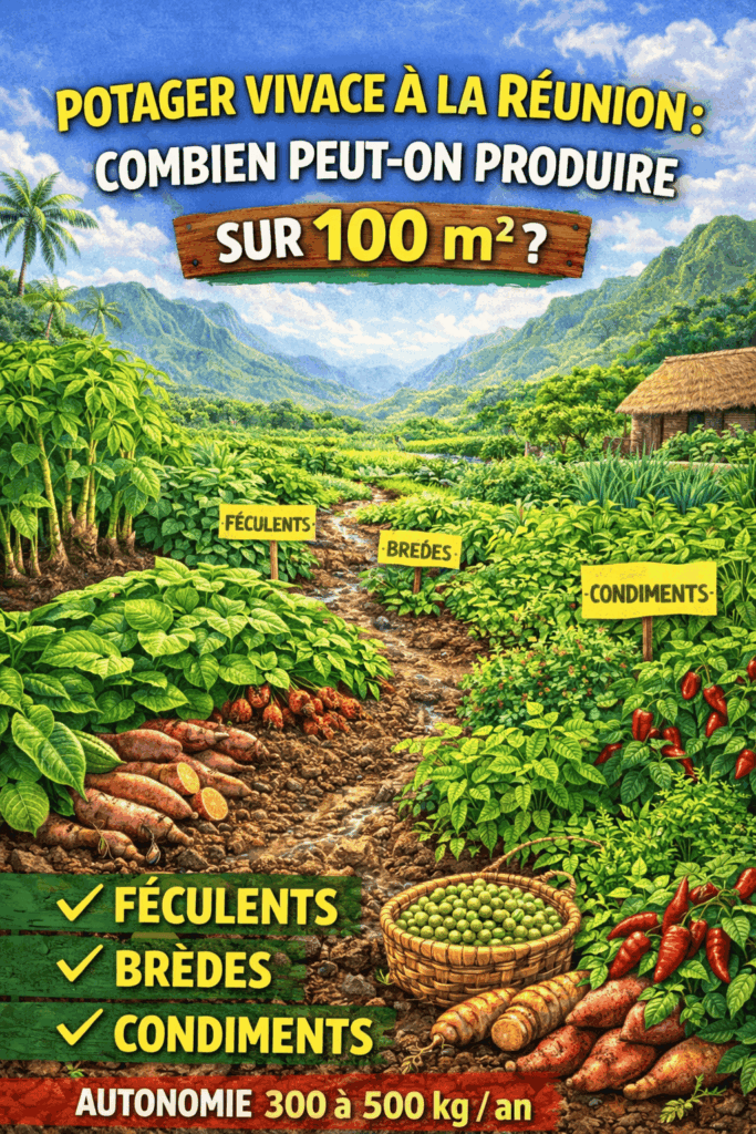 Introduction Beaucoup se demandent : Peut-on réellement produire une part significative de son alimentation sur 100 m² à La Réunion ? En climat tropical, la production peut être continue.Mais elle doit être organisée. Voici une estimation réaliste basée sur un potager vivace structuré. 🌱 Hypothèse de base Surface : 100 m²Organisation : par stratesCulture : […]