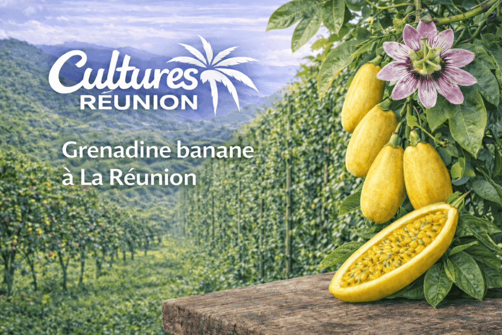 Grenadine banane à La Réunion : culture et production La grenadine banane (Passiflora tripartita var. mollissima), aussi appelée fruit de la passion banane, est une liane tropicale originaire d’Amérique du Sud. Elle est appréciée pour ses fruits allongés à peau jaune et à pulpe très parfumée. À La Réunion, elle se cultive principalement dans les