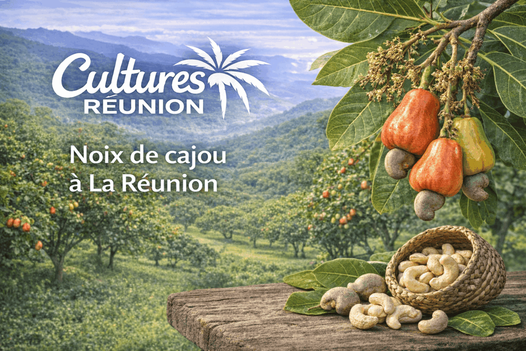 Noix de cajou à La Réunion : culture et production La noix de cajou provient de l’anacardier, un arbre fruitier tropical originaire d’Amérique du Sud. Il est cultivé pour sa graine comestible, très appréciée en cuisine, ainsi que pour son faux-fruit appelé “pomme de cajou”. À La Réunion, l’anacardier s’adapte principalement aux zones chaudes et